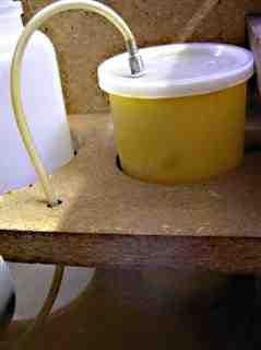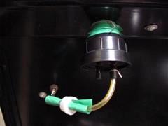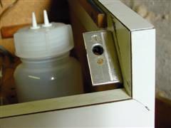 Beide Maschinen haben nur ein Waschflüssigkeitssystem. Dennoch gibt es DREI Aussparungen für Gefäße. Die vorderen Aussparungen hat einen kleineren Durchmesser. Eine RCM hat im Moment keinerlei Gefäße. Bei der anderen steckt in der Aussparung ein Plastebecher, in den die Druckluft der Vacuum-Pumpe geleitet wird...: Schalldämpfer? Ölabscheider? beides?? Der Plastic-Becher ist zumindest "Made in Britain".