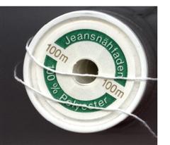 Der Polyester-Faden wurde mir als Jeans-Garn - naturfarben - verkauft; ohne nähere Angaben zur Fadenstärke. Es ist dicker als 50er Baumwoll-Faden. Langzeiterfahrungen hab ich damit noch nicht, es funktioniert aber keinensfalls schlechter als Baumwollfaden. Die Spulen sind leider zu gross (100m) um direkt in die "GrooVe Laundry" zu passen und müssen umgewickelt werden.