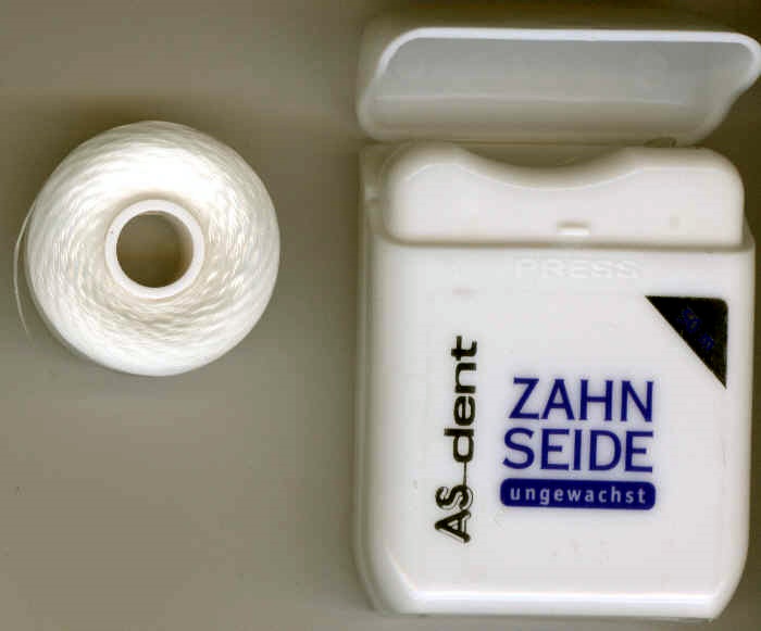 Ungewachste Zahnseide, 50-Meter-Rolle aus irgendeinem Drogeriemarkt (1,49 Euro). Kunstfasern (vermutlich Nylon) mit deutlich sichtbarer Faserstruktur, kaum verzwirnt. Funktioniert - ähnlich dem Polyester-Faden.