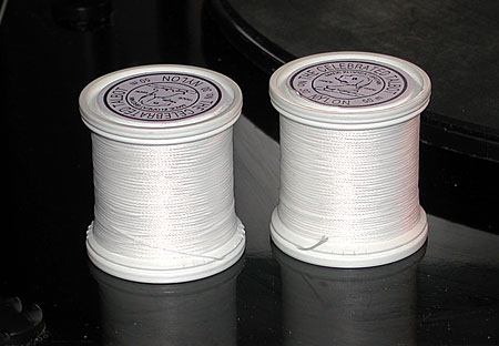 Frank Gales - der selber eine Seite im Netz hat - sagt, das der original-keith-monk-faden Polyester ist, etwas dicker + stark verzwirnt:
