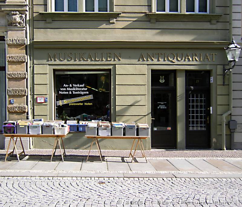 Ein seitlicher Abstecher, entlang der Nikolaikirche, über den Markt, zum Thomaskirchhof: Ideal für Vinyl-TOURISTEN: wer ins Musikalien-Antiquariat geht, hat gleich noch mehrere Punkte im touristischen Mehrkampf: gegenüber der Thomaskirche und dem Bachdenkmal, neben dem Bachmuseum.